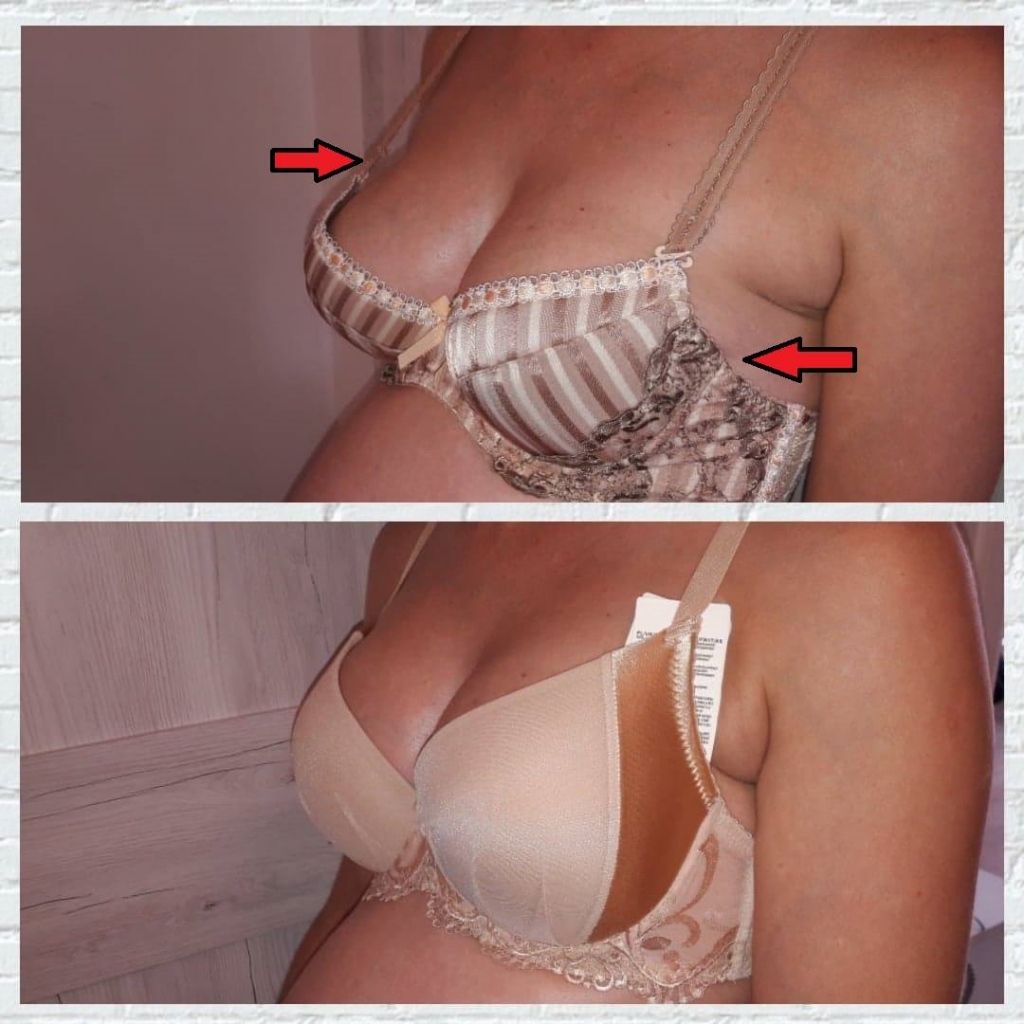 Na górnym zdjęciu widzimy za małe miseczki oraz ucisk fiszbin w pierś – co może utrudniać i blokować przepływ limfy. Biustonosz jest także zdecydowanie za luźny, miseczki odstają i stanik nie spełnia żadnej ze swoich funkcji.